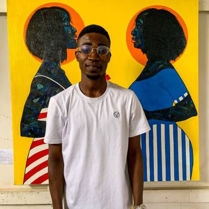 Playing very close to the peripheries of flatness and adding dimensionality through his depictions of facial features, the portraits of Oluwabori take the form of, or one could even say mimic the colour by numbers structure of kids and adult colouring and painting manuals and books.